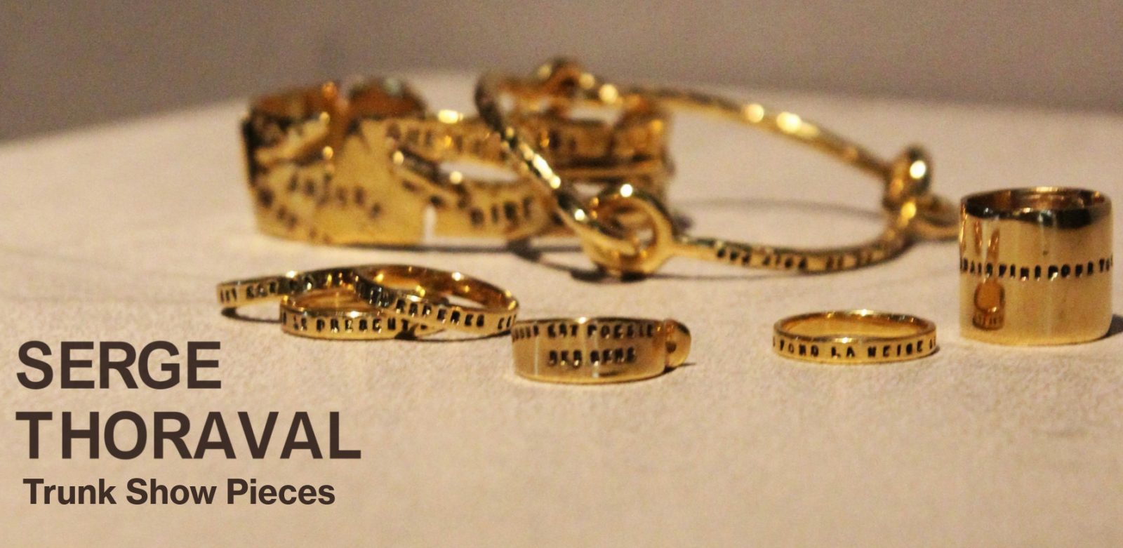 ゴールドの持つあたたかみが、刻まれたメッセージをよりやわらかく身にまとう人を包み込むSERGE THORAVALのジュエリー。